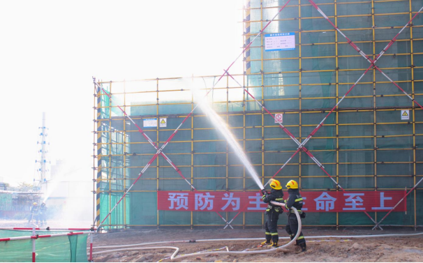 下午两点整,随着一声警笛长鸣,演练正式开始。此次演练模拟了项目建设现场突发火情,火势较大且有施工人员被困工地内的这一危急情况。