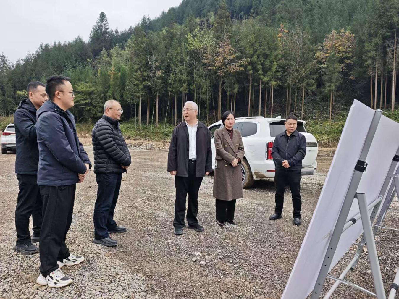 在安州区国家储备林项目现场,吴昊实地调研项目建设情况,详细了解项目生态效益及后续运营计划。严昆就项目具体进展、资源整合成果及下一步工作计划作了详细汇报。