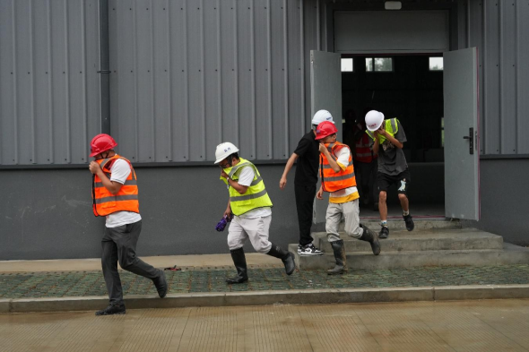 此次演练模拟了施工现场因电气短路引发火灾的场景。随着警报声响起,演练正式开始,现场迅速启动应急预案,施工人员在引导人员的指挥下,用衣服捂住口鼻,弯腰低姿,迅速、有序地从安全通道撤离到指定的紧急集合点,整个疏散过程仅用时2分钟,所有人员均安全疏散完毕。与此同时,安州区消防救援大队救援人员迅速到达现场,使用消防车对着火点进行灭火扑救。
