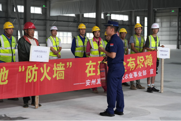 6月26日,现代农业事业部特邀请安州区消防救援大队,在冷链物流项目建设现场举行消防安全演练,项目建设单位、施工单位、监理单位人员参加演练。