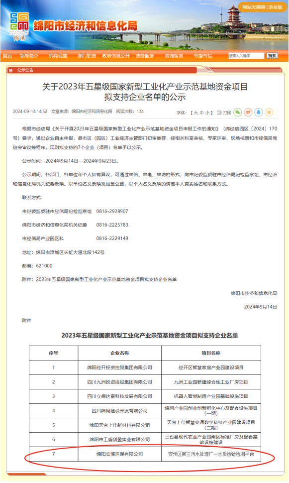 近日,绵阳市经济和信息化局公布“2023年五星级国家新型工业化产业示范基地资金项目”拟支持企业名单,全市仅7家企业上榜,安州区第三污水处理厂—水质检验检测平台名列其中。