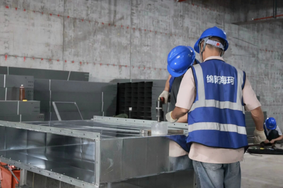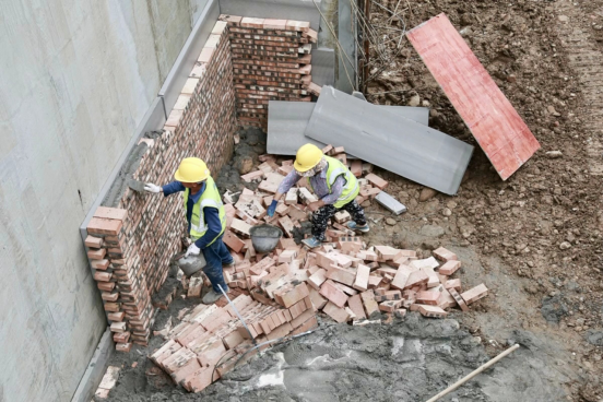 项目现场,工人们正紧锣密鼓地进行着外墙防水及防水保护层、地下室消防管道、桥架安装等施工作业。