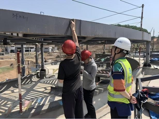 在户外温度逼近40℃的极端环境下,钢结构、路面及检测设备表面温度均突破50℃。面对“烤”验,检测团队始终秉持高标准、严要求的工作准则,对重点部位和关键环节进行全方位检测。他们或俯身记录路面数据,或攀爬钢结构查验焊缝,汗水浸透工装却丝毫不影响操作精度,用实际行动诠释“数据不妥协、质量不打折”的职业信念。