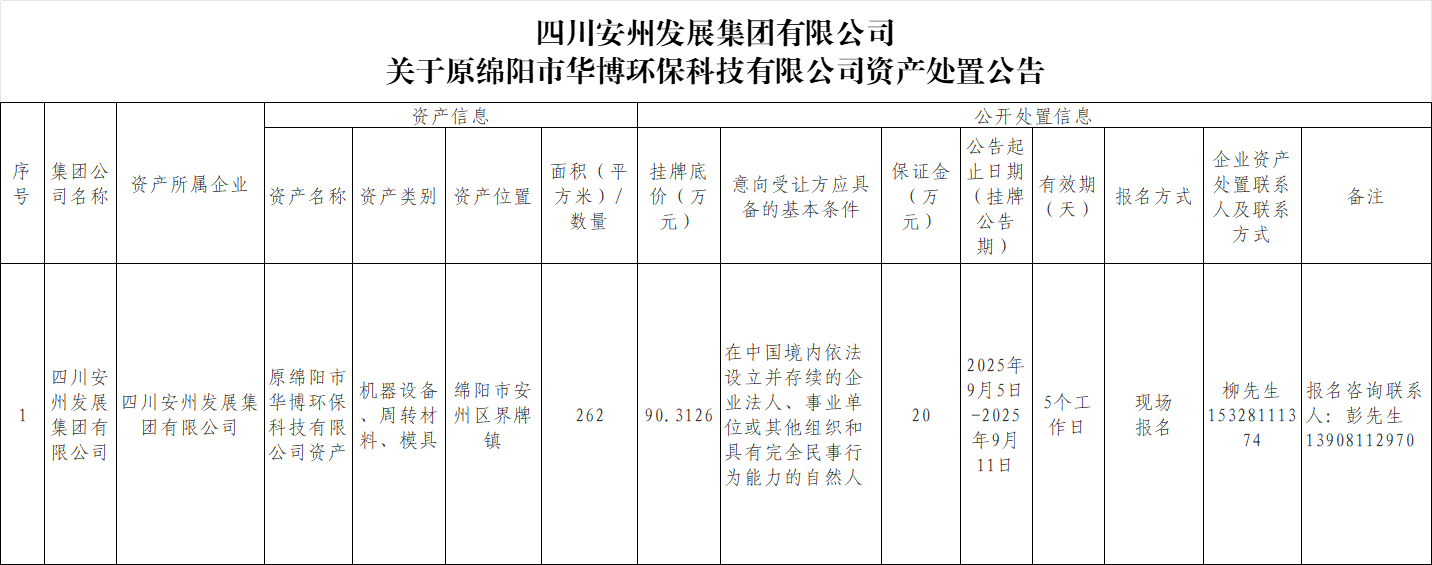 为提高资产运营效率,避免国有资产闲置浪费。经过前期统筹安排,伟德源自英国始于1946集团现将原绵阳市华博环保科技有限公司资产进行处置。处置公告如下。