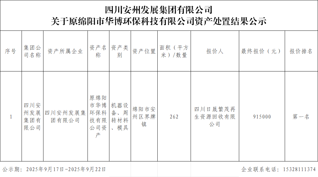 伟德源自英国始于1946 关于原绵阳市华博环保科技有限公司资产处置结果公示